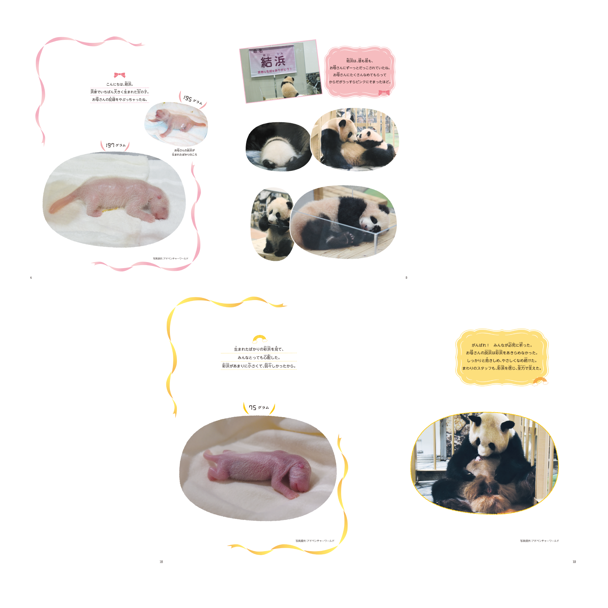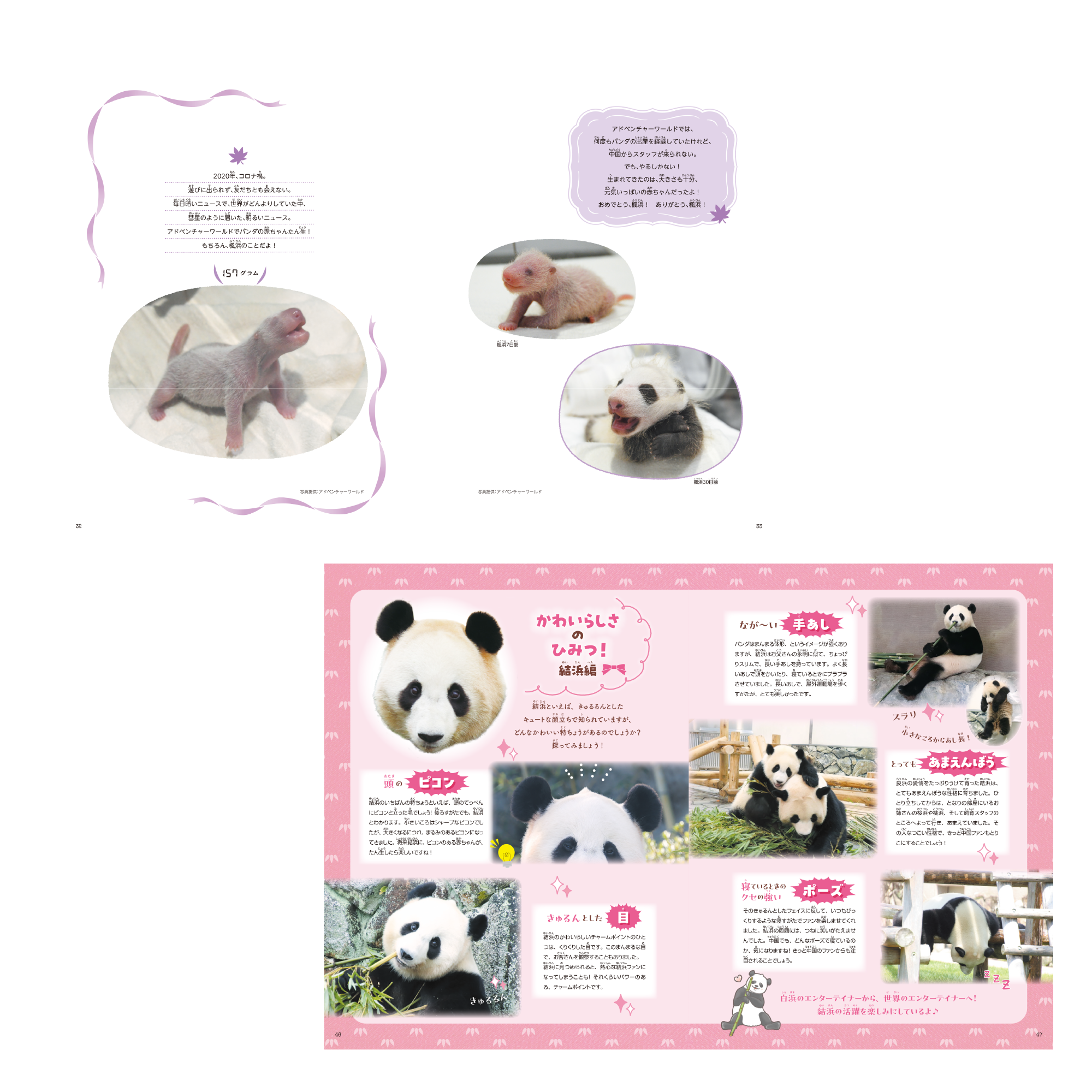 2025年6月28日に中国へ旅立った3頭の娘たち(結浜8歳、彩浜7歳、楓浜4歳)をメインに、とっておきの写真とエピソードでつづります。 結浜は大きく生まれ、お母さん良浜と生まれたての時に一番長い時間を過ごしました。 彩浜は75gという超未熟児で誕生し、命も危ぶまれましたが、けがや病気ひとつなく、無事に大きく成長しました。 さらに、末っ子の楓浜はコロナ禍で、中国人スタッフが来日できずアドベンチャーワールドのスタッフのみで出産をさせた… など、パンダそれぞれに感動を呼ぶエピソードがあります。 思い出をありがとう!これからもすくすく成長して素敵なパン生を送ってほしいと願うファンの方々にとって、いつでも娘たちを思い出せる、永久保存版の1冊です。 ※結浜8歳、彩浜7歳、楓浜4歳は、2025年9月1日時点の年齢です。